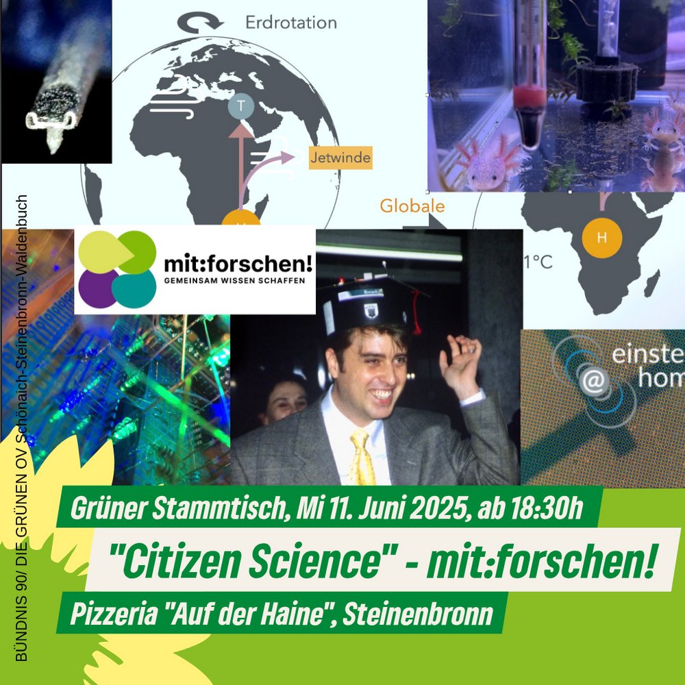 Unter https://www.mitforschen.org/ findet man vorab ein wenig in das Thema ein - und alle Interessierten sind herzlich eingeladen, am "Grünen Stammtisch" in der Pizzeria "Auf der Haine" ins Steinenbronn am Mittwoch, 11. Juni 2025, ab 18:30h teilzunehmen!