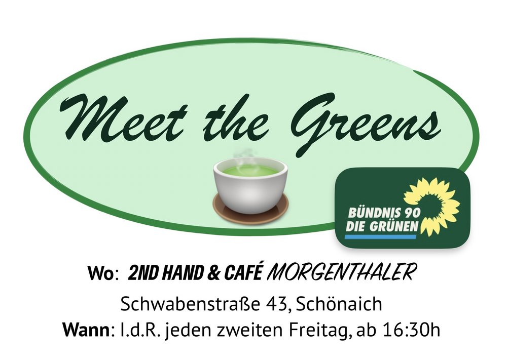 "Meet the Greens" ist das Angebot, die Mitglieder des Ortsverband BÜNDNIS 90/DIE GRÜNEN und die Fraktion der Grünen im Gemeinderat zu treffen, um sich kennenzulernen, im gegenseitigem Austausch zu bleiben oder den Bürgerinnen und Bürgern ein offenes Ohr zu bieten.