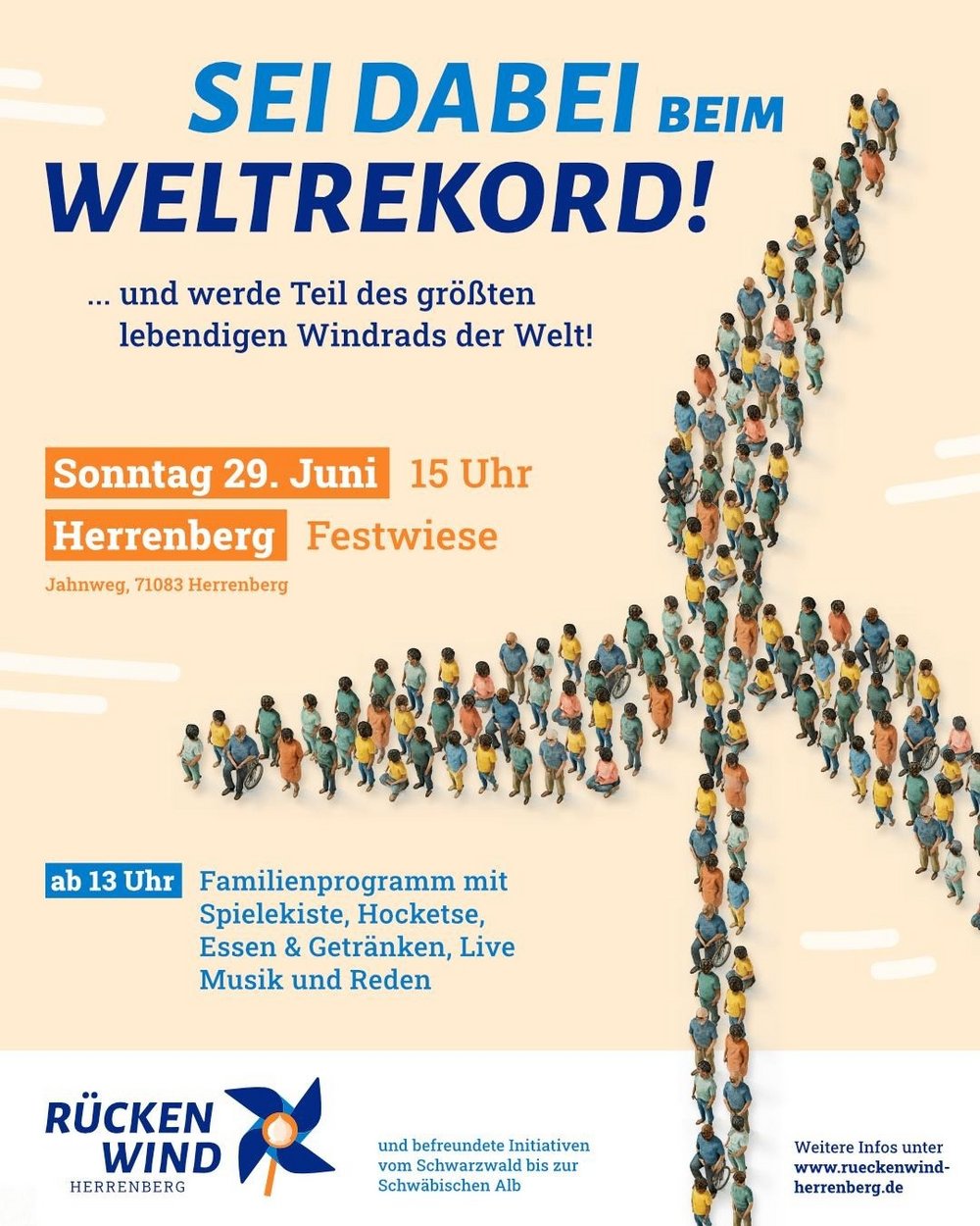 Im Rahmen der Planungen von Windenergieanlagen im Landkreis Böblingen unterstützen wir aktiv die Windenergie BB, die u.a. am 29. Juni in Herrenberg einen Weltrekord-Versuch eines „laufenden“ menschlichen Windrads aufstellen möchte. Zugleich werden wir hier auch mit der Regionalgruppe Schönbuch der Bürgerenergiegenossenschaft Teckwerke mitwirken. Zu dieser Aktion möchte ich Euch ermutigen, mitzuwirken, sodass wir mit Recht sagen können: Ein Flügel dieses menschlichen Windrads kommt aus dem Schönbuch/Aichtal. Mit einer Fahrrad-Sternfahrt ist auch hier ein gemeinsames Event in Planung. Mehr, auch zur Fahrrad-Sternfahrt zum Event ist hier zu finden: https://windkraftbb.de/rad-sternfahrt/